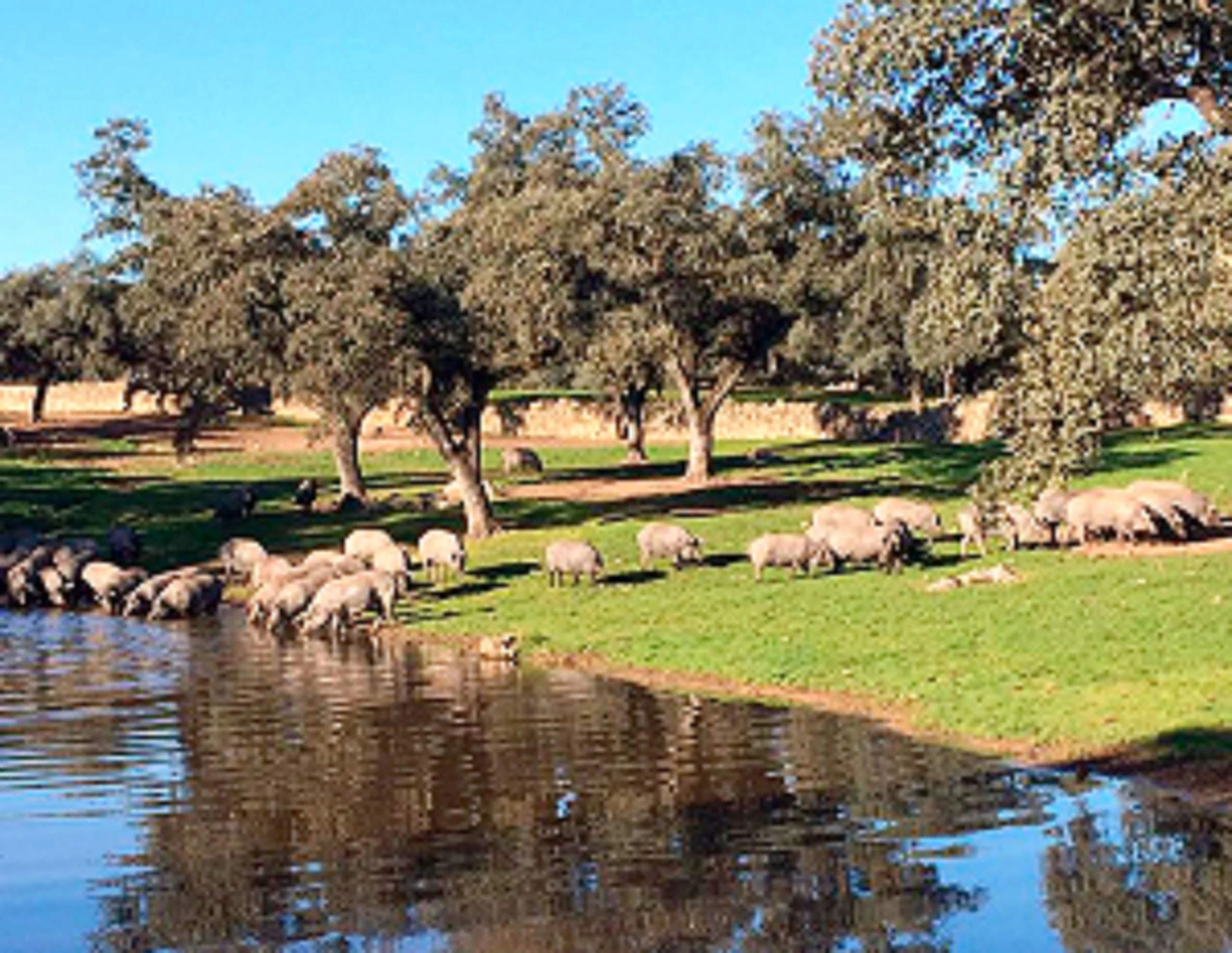 - El jamón proviene de cerdos de raza ibérica criados en campos y alimentados a base de hierbas aromáticas, leguminosas y cereales naturales, ricos en sodio, fibra y proteínas. En el corte se pueden apreciar pequeñas «motas» o «cristales» de color blanco, señal de una curación lenta y una baja salinidad.